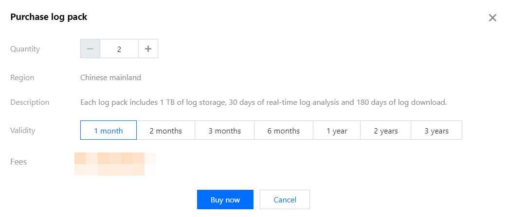 3. 在续费服务日志包弹窗中,选择付费时长,单击立即续费。