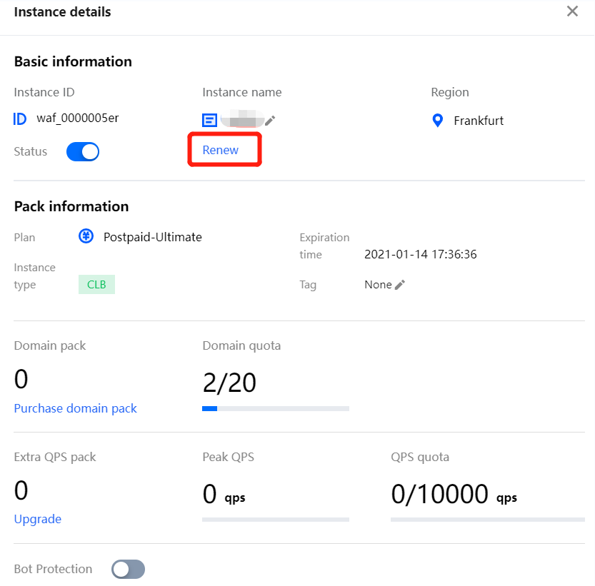 为了可以继续享受正常的安全服务,您可以在 Web 应用防火墙服务到期前为其手动续费,也可以设置到期自动续费。