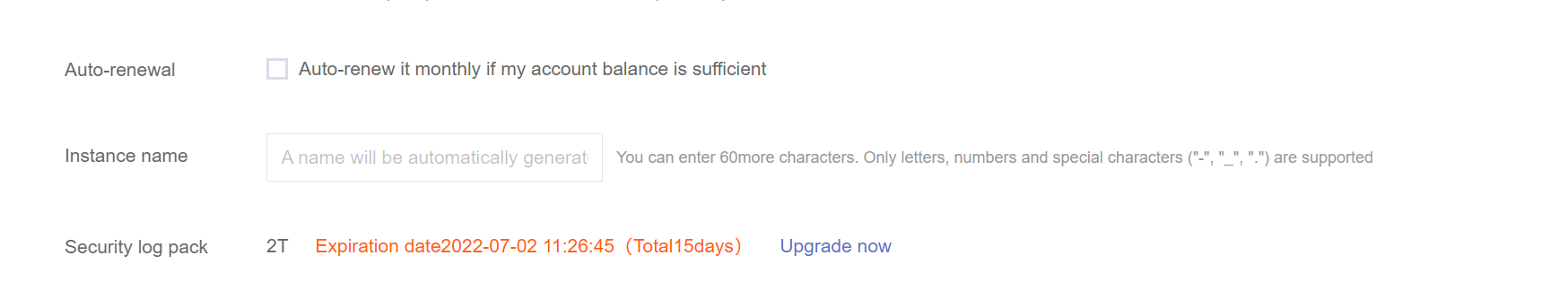 安全服务日志包续费周期与实例到期时间相对应,即只能续费到实例到期前。