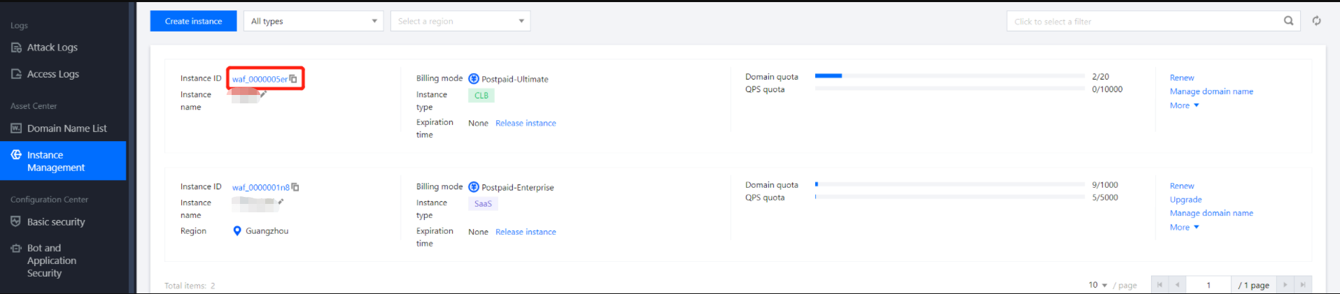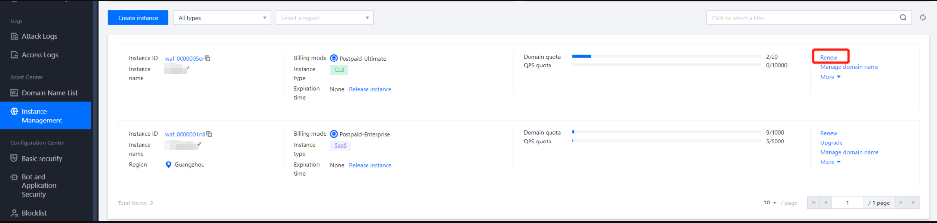 如需单独续费 WAF 套餐实例、BOT 与业务安全服务、域名扩展包及 QPS 扩容包请前往 费用中心 续费。 2. 在实例管理页面,支持如下两种续费方法: