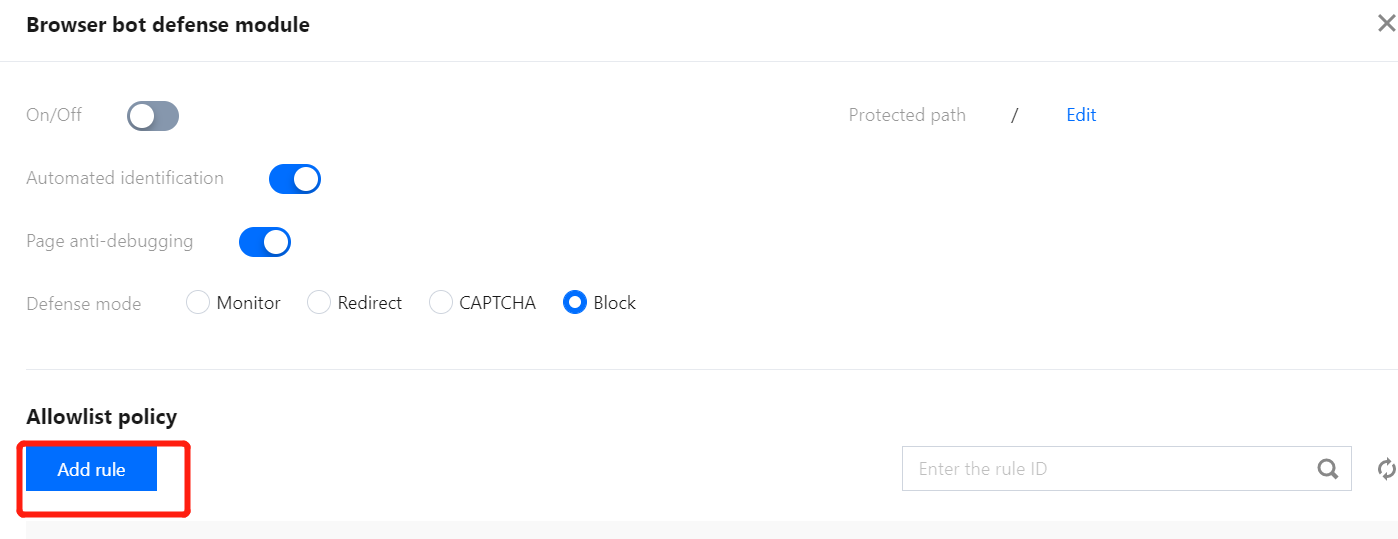 兼容性说明:前端对抗适用于网页或 HTML5 业务防护,通过前端对抗技术,动态生成客户端 ID 和 Token,通过检测客户端 ID 和动态 Token,完成恶意和爬虫请求识别。在特定情况下,POST 请求可能存在兼容性问题(响应体 content-type 内容不为:text/html,且响应体中未包含有<html>标签),导致前端动态检测异常,此时可以对请求路径或者响应请求进行加白处理。