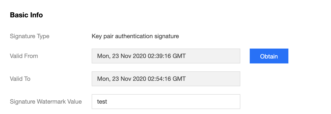 3. 在基本信息栏中,单击获取,自动填充签名有效时间。