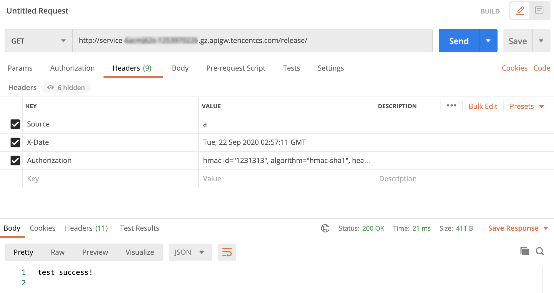打开 Postman,将 Source、X-Date、Authorization 三个参数填写在 Header 中,并填写 API 请求地址、API 请求参数等信息,单击 Send,即可发起对密钥对认证 API 的调用。