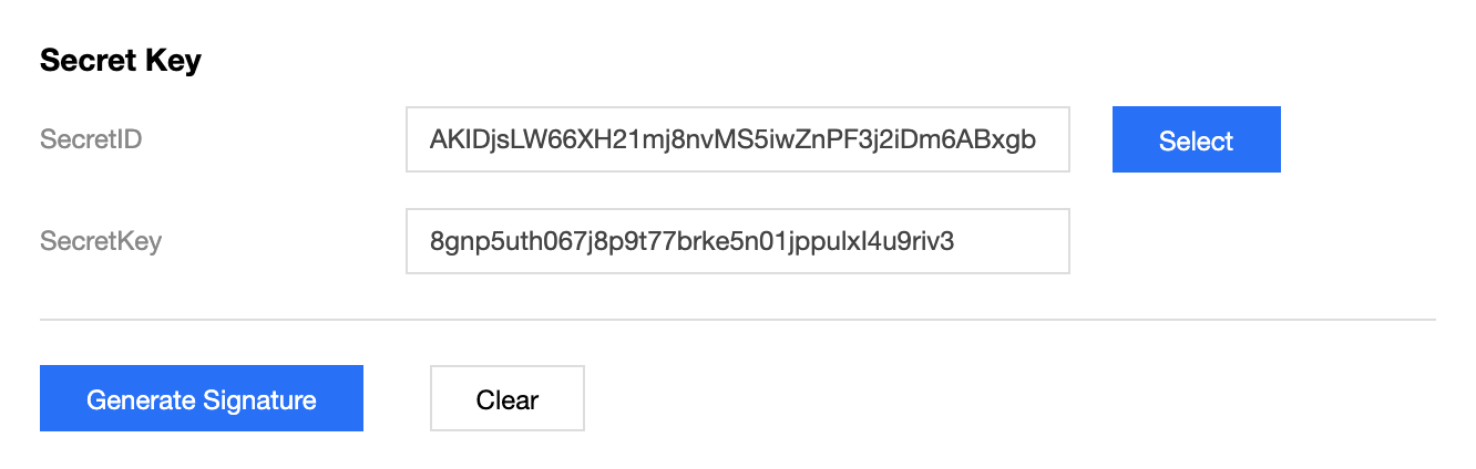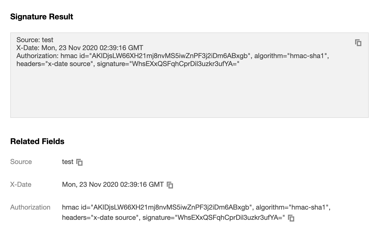 单击生成签名,即可在右侧展示区中查看请求签名结果。主要参数介绍如下: