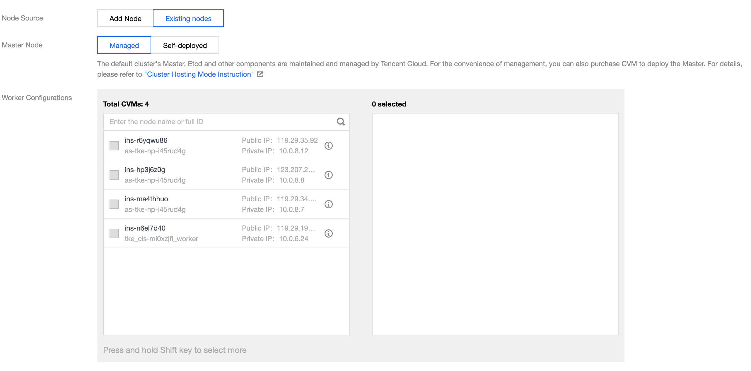 第2步-选择机型中,节点来源选择已有节点;Master 节点选择平台托管,Worker 配置选择 步骤2 中创建的 CVM。 其余配置项均采用默认配置即可。