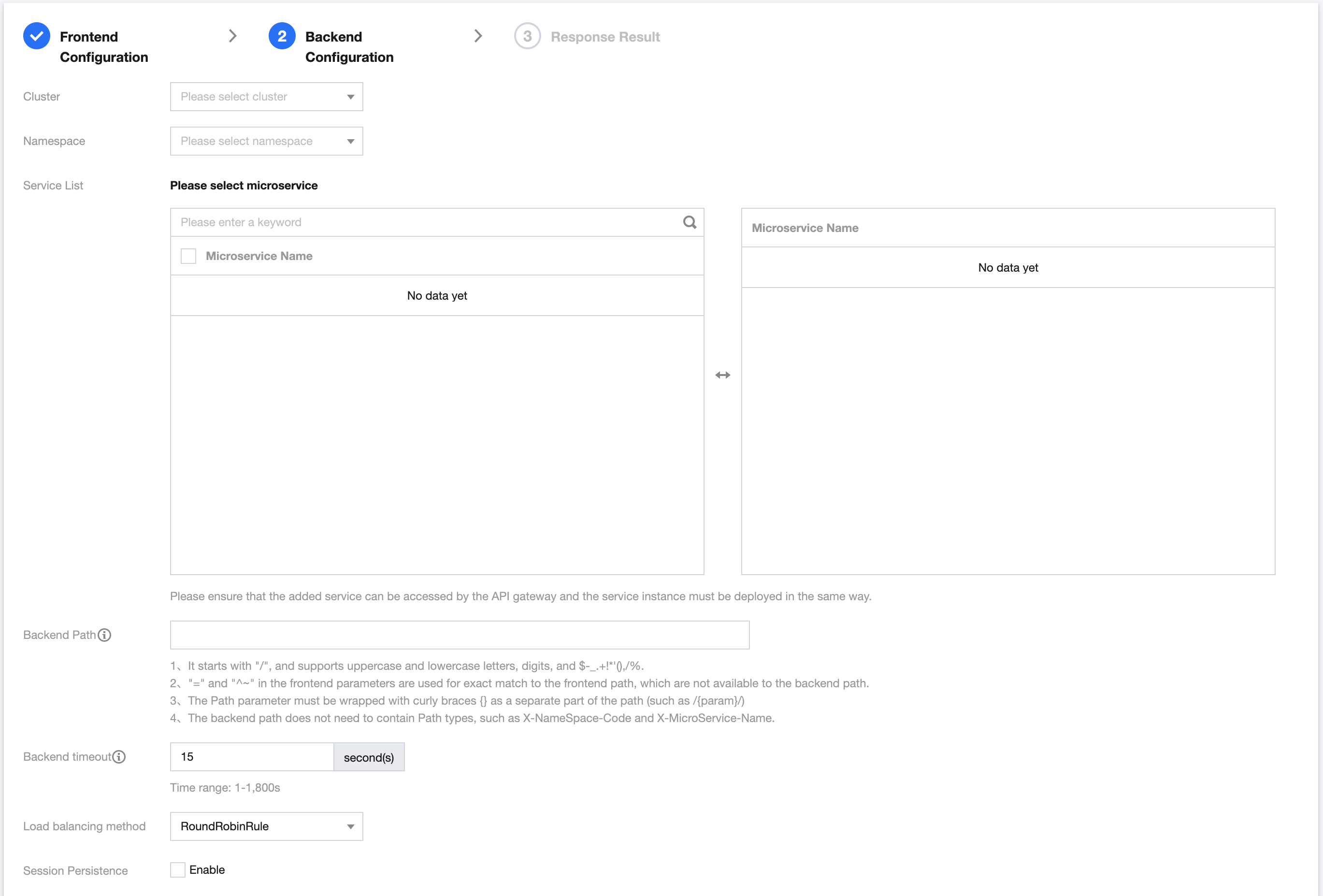 X-NameSpace-Code 路径参数是后端配置中所选择的命名空间在 腾讯微服务平台 命名空间中配置的 code 值。 X-MicroService-Name 路径参数是后端配置中所选择的集群在 腾讯微服务平台 服务治理中配置的微服务名称。 7. 单击下一步,进行后端配置。