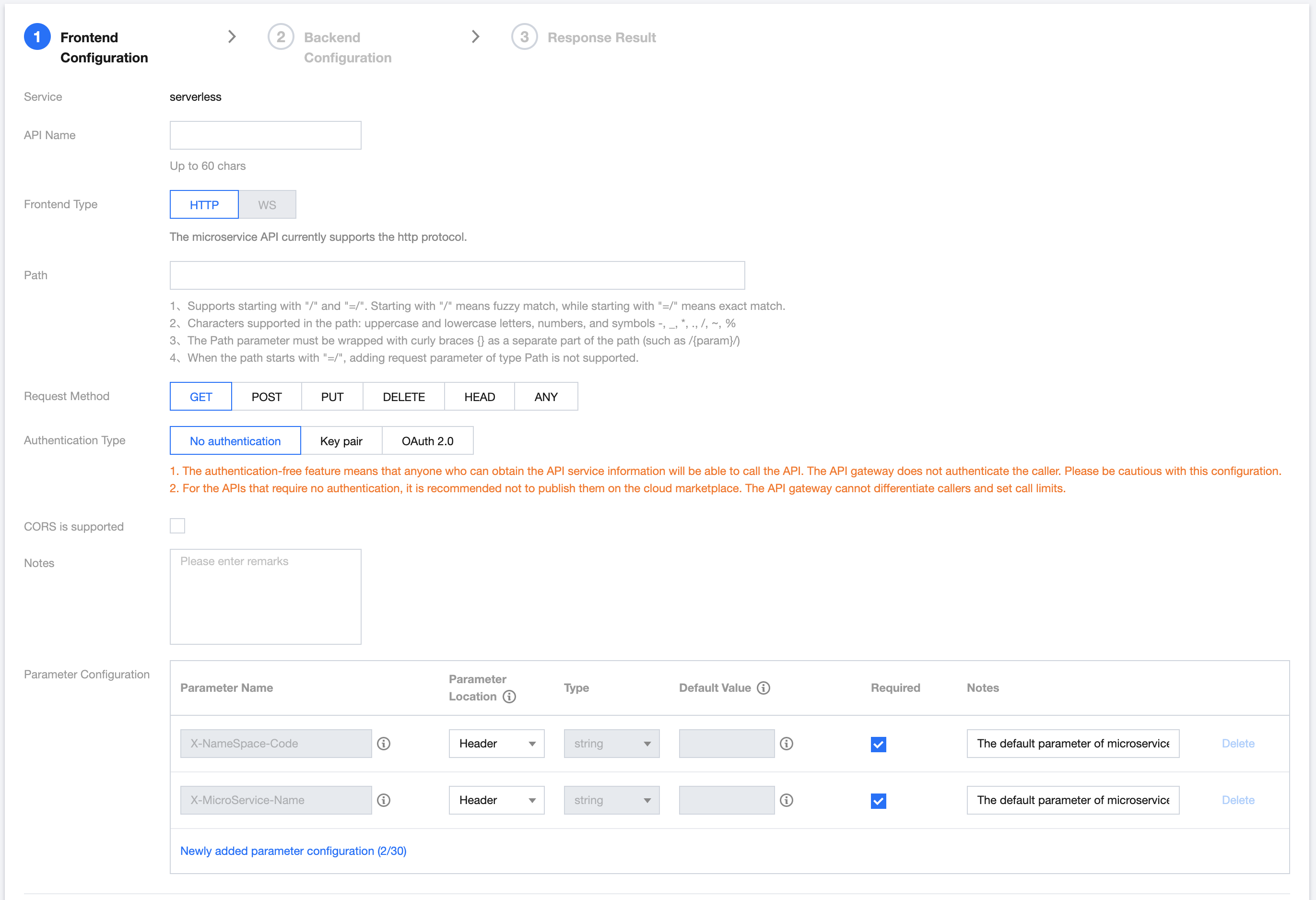 后端参数:X-NameSpace-Code、X-MicroService-Name这两个参数为固定参数,不可做映射,用户配置的其他参数均可做映射。