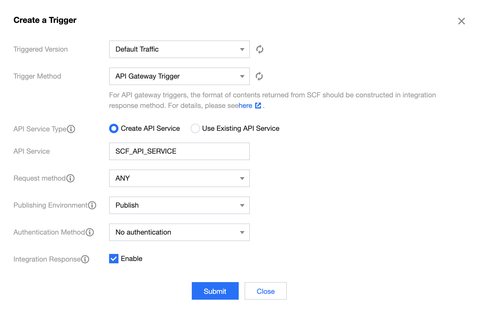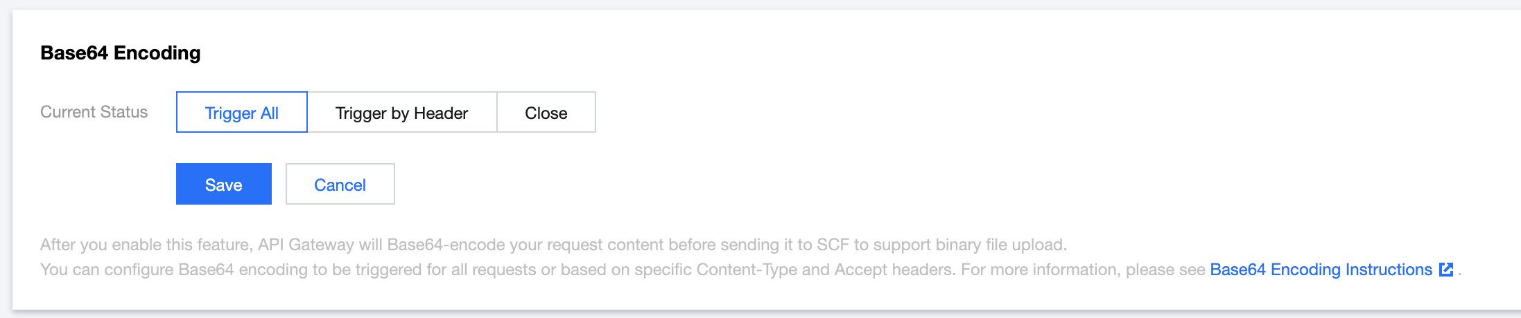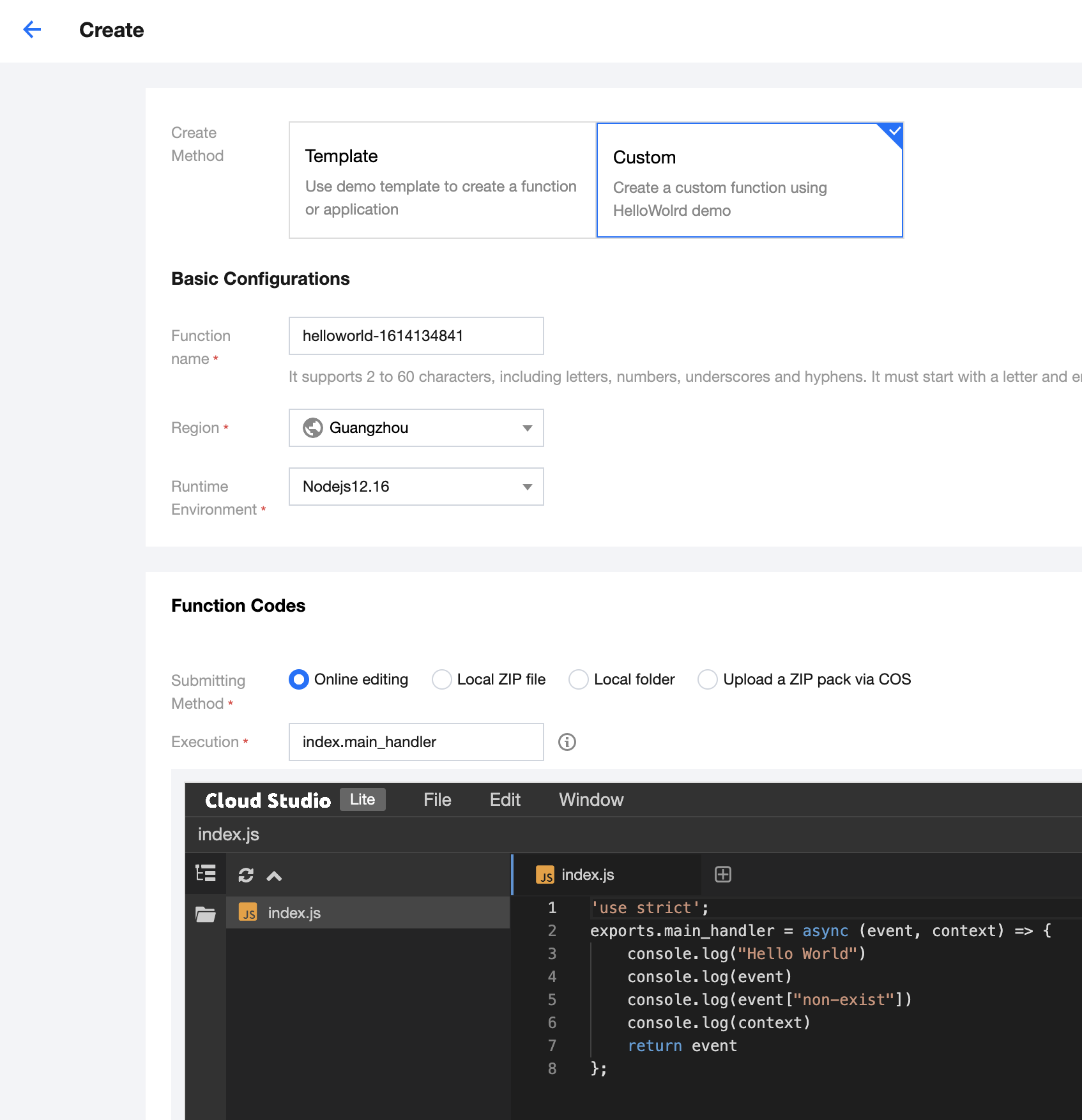 // handler.js"use strict";const stream = require("stream");const Busboy = require("busboy");/** 处理用户上传 (POST) */const handlePost = (event) => {return new Promise((resolve, reject) => {const busboy = new Busboy({ headers: event.headers });let html = "";/** 接受到文件 */busboy.on("file", (fieldname, file, filename, encoding, mimetype) => {let buf = Buffer.alloc(0);console.log({ fieldname });/** 接受到文件的数据块,拼接出完整的 buffer */file.on("data", function (data) {buf = Buffer.concat([buf, data]);});/** 文件的数据块接受完毕,生成 DOM 字符串 */file.on("end", function () {const imgBase64 = buf.toString("base64");html += ``;});});/** multipart/form-data 接受完毕,构造并返回生成的 html */busboy.on("finish", function () {console.log({ msg: "Parse form complete!", html });resolve({statusCode: 200,headers: {"content-type": "text/html",},body: html,});});/*** busboy 需要 stream pipe 的方式来进行处理,* 我们将 body 解码为 buffer后,* 转换为 stream,最终 pipe 给 busbody*/const bodyBuf = Buffer.from(event.body, "base64");var bufferStream = new stream.PassThrough();bufferStream.end(bodyBuf);bufferStream.pipe(busboy);});};/** 返回静态文件 */const handleGet = (event) => {const html = `<html><head></head><body><form method="POST" enctype="multipart/form-data"><input type="file" name="image-1" accept="image/*"><br /><input type="file" name="image-2" accept="image/*"><br /><input type="submit"></form></body></html>`;console.log({ msg: "Get form complete!", html });return {statusCode: 200,headers: {"content-type": "text/html",},body: html,};};/** 云函数入口函数 */exports.main_handler = async (event, context) => {const method = event.httpMethod;/** 当请求为 POST 请求时,我们处理用户的 multipart/form-data,并生成展示上传结果的页面 */if (method === "POST") {return handlePost(event);}/** 当请求为 GET 请求时,我们返回上传文件的页面 */if (method === "GET") {return handleGet(event);}};