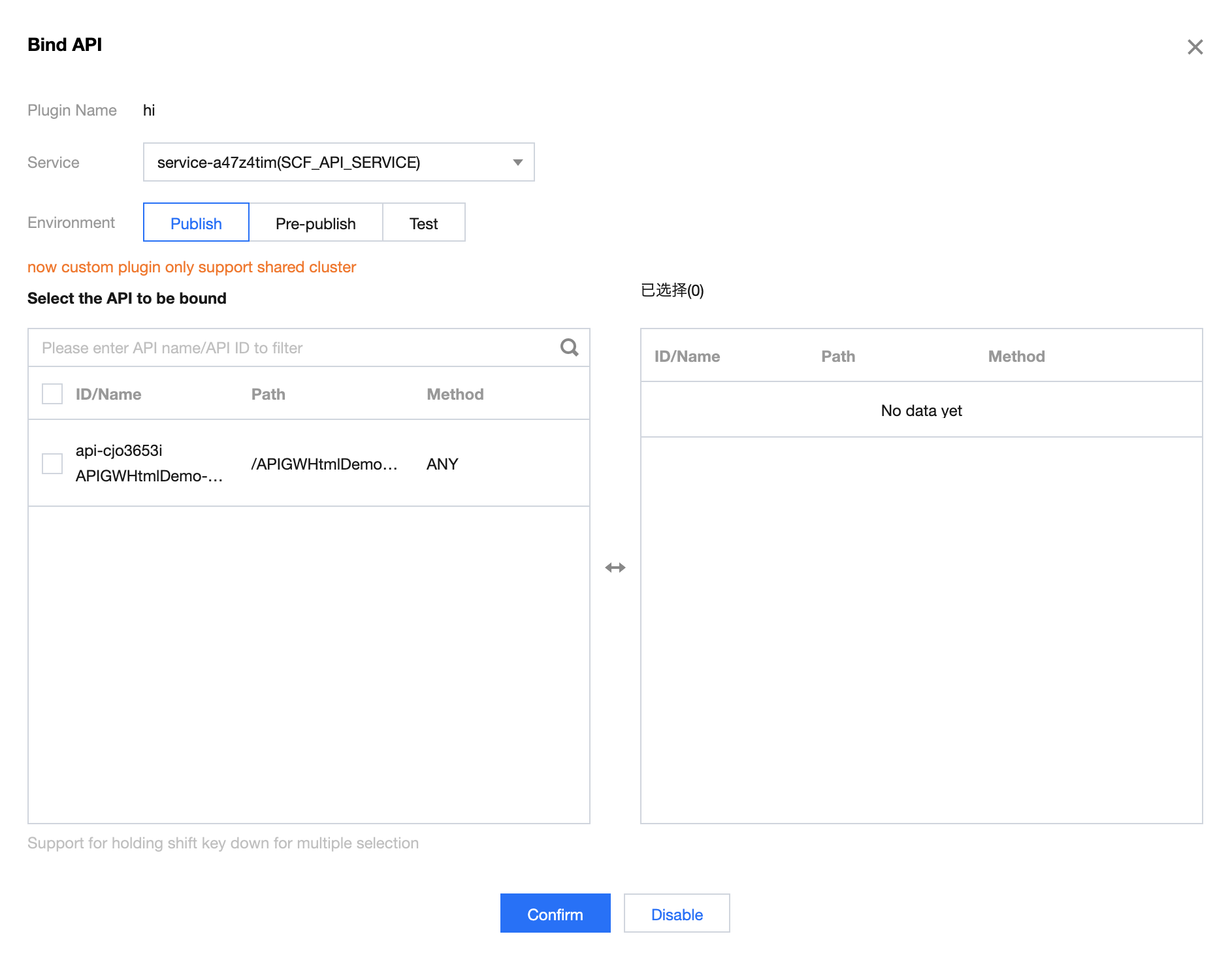 API 只有发布到相应环境后,才能和插件进行绑定,未发布的 API 不支持绑定。