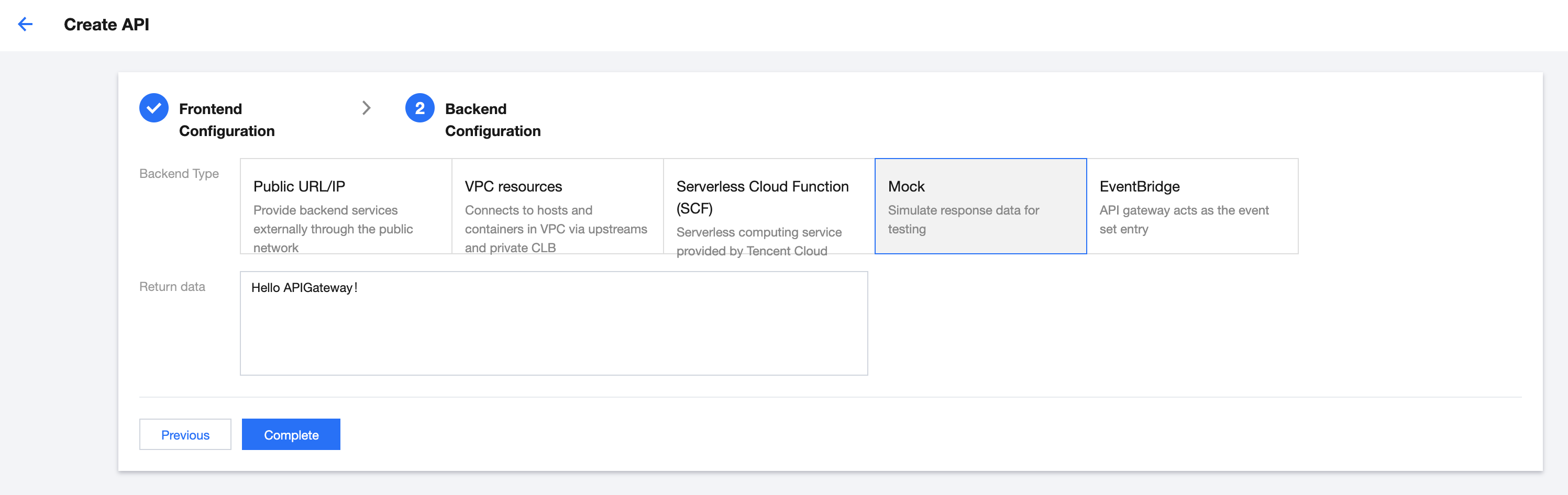 后端类型:此 API 后端服务所属类型,此处我们选择“Mock”。