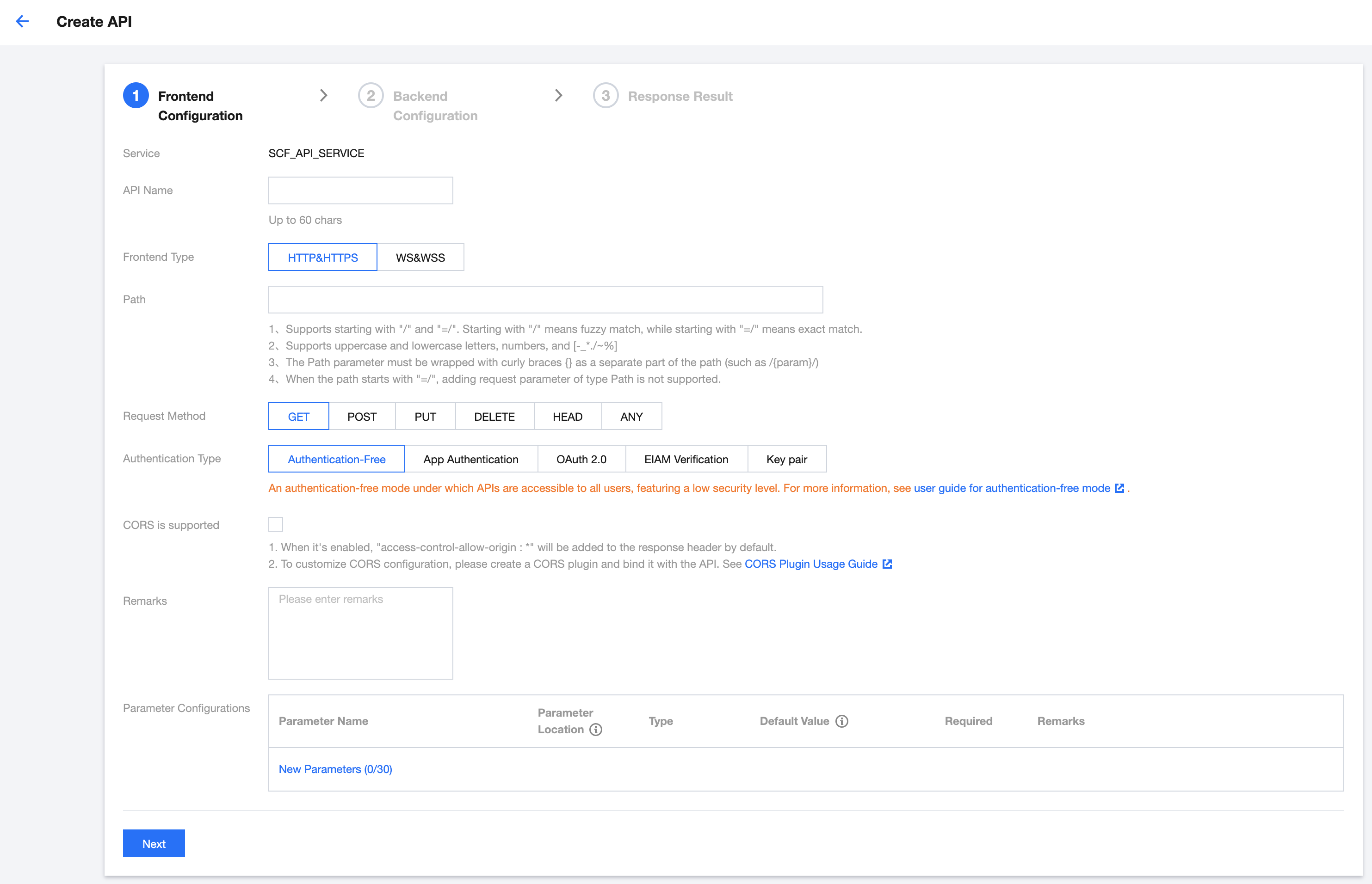 鉴权类型:此 API 的鉴权类型,此处我们选择“免认证”。