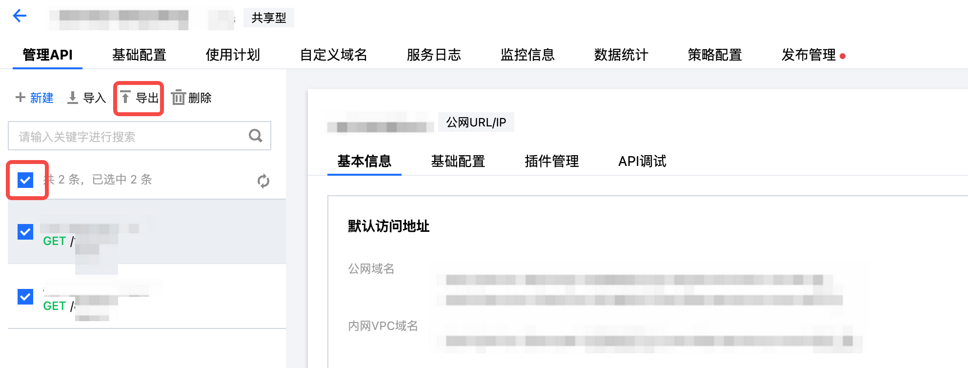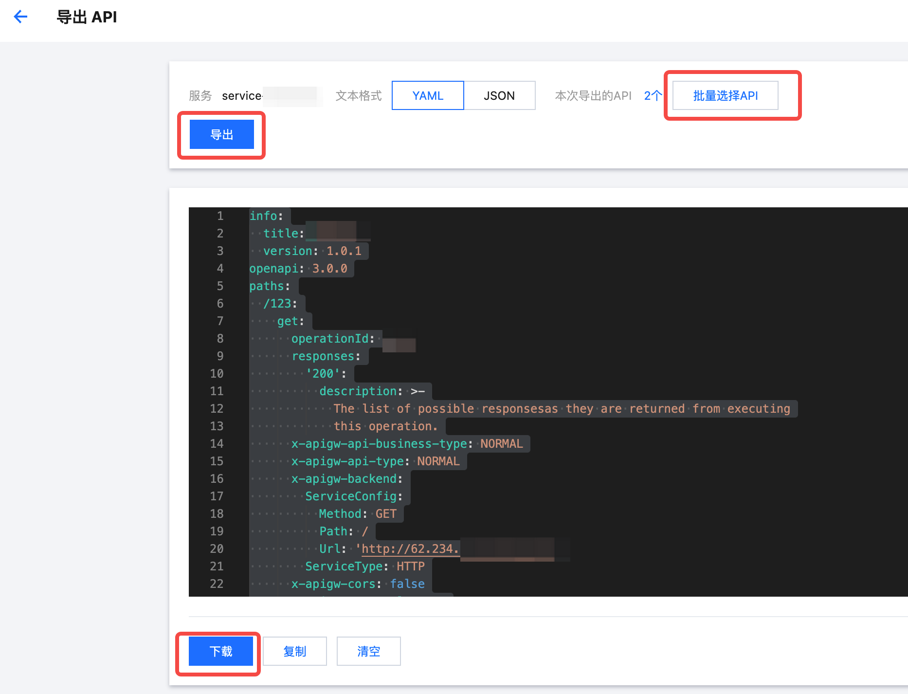 5. 依次单击批量选择API、导出、下载,即可将该服务中 API 配置信息全部导出,但每次最多导出50条,如超出50条,则需要分次导出。将导出的文件保存好。