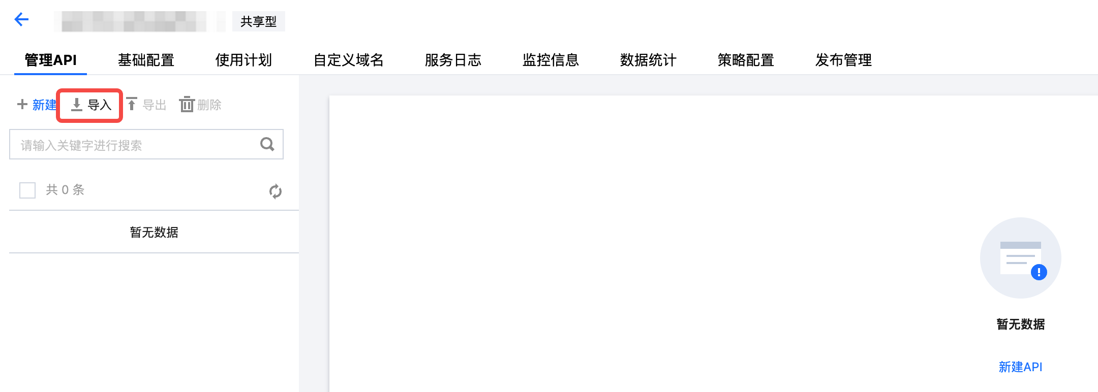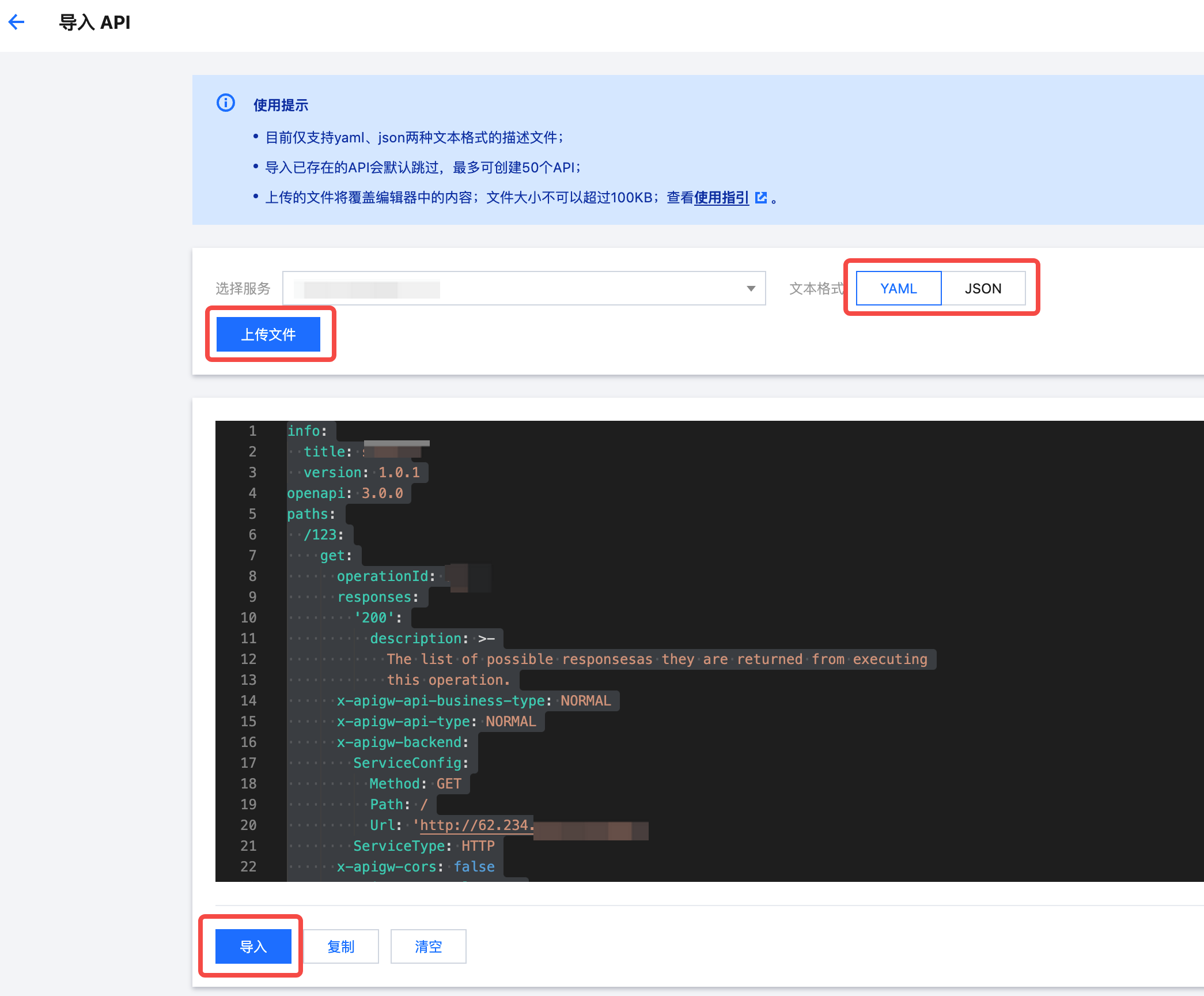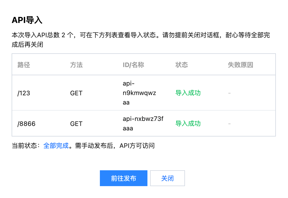 2. 在页面依次选择服务 > 选择文本格式 > 上传文件 > 导入,具体可参见 导入 API。在上传文件时选择之前导出的文件。 3. 导入完成后会提示需要发布服务,单击前往发布,完成即可,具体可参见 服务发布。 在广州地域删除服务