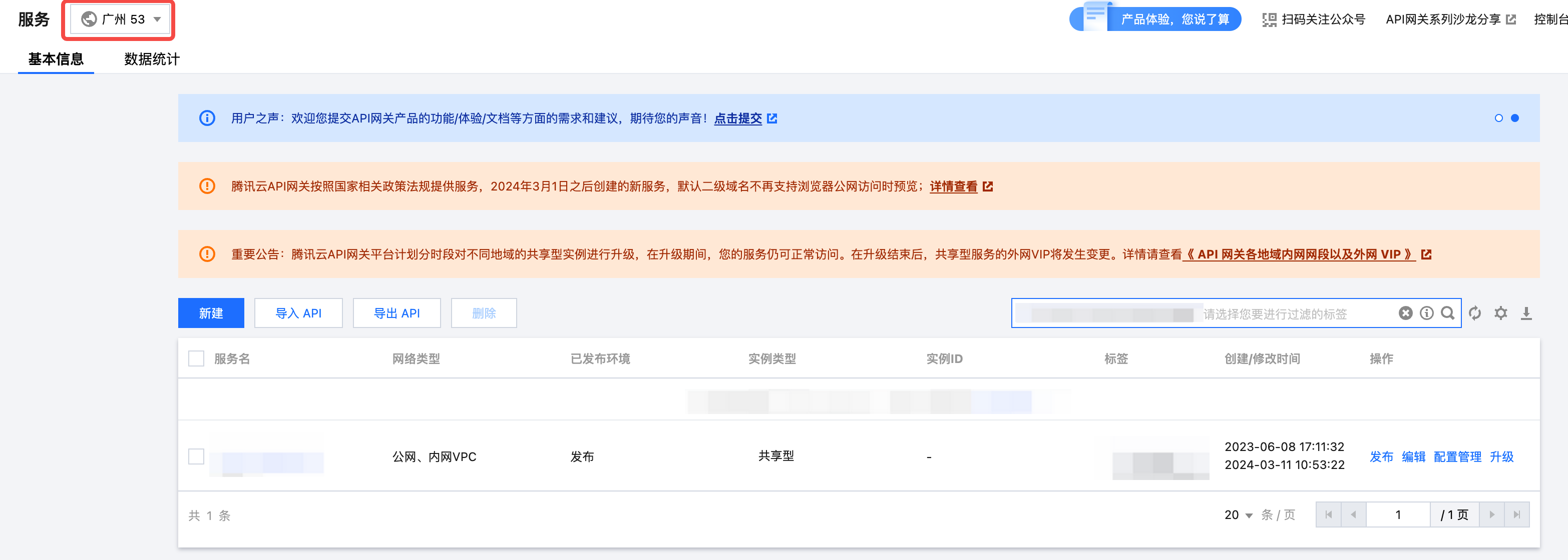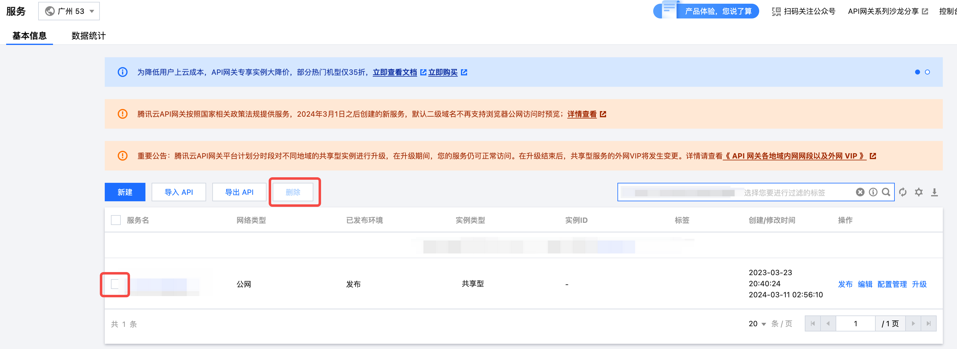 2. 在地域列表中选择广州,找到 需要迁移的服务。在确保北京地域的服务可以正常访问的情况下,可将该服务删除。