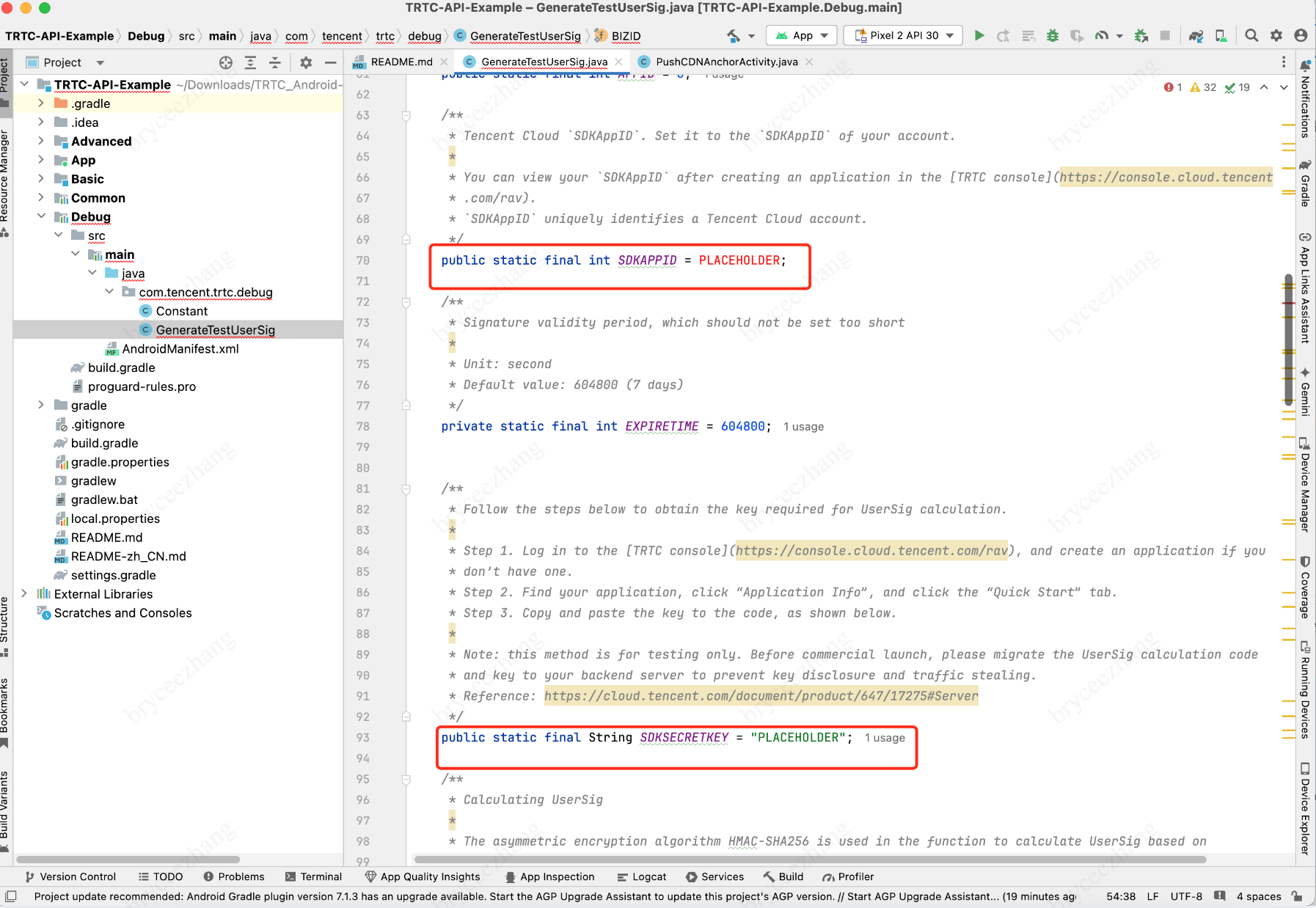 3. 将TRTC-API-Example/Debug/src/main/java/com.tencent.trtc.debug目录下GenerateTestUserSig中的 SDKAPPID 和SDKSECRETKEY 替换为您在步骤2中获取到的值。