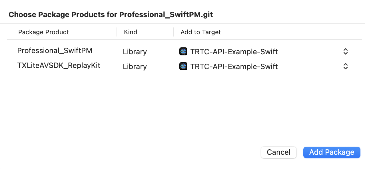 选择您要加入到的 target,其中TXLiteAVSDK_ReplayKit是我们的屏幕录制组件: