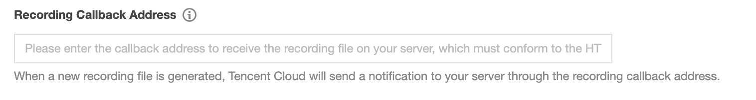 如果您需要实时接收到新文件的 落地通知,可在此处填写您的服务器上用于接收录制文件的回调地址,该地址需符合 HTTP(或 HTTPS)协议。当新的录制文件生成后,腾讯云会通过该地址向您的服务器发送通知。 录制回调密钥: