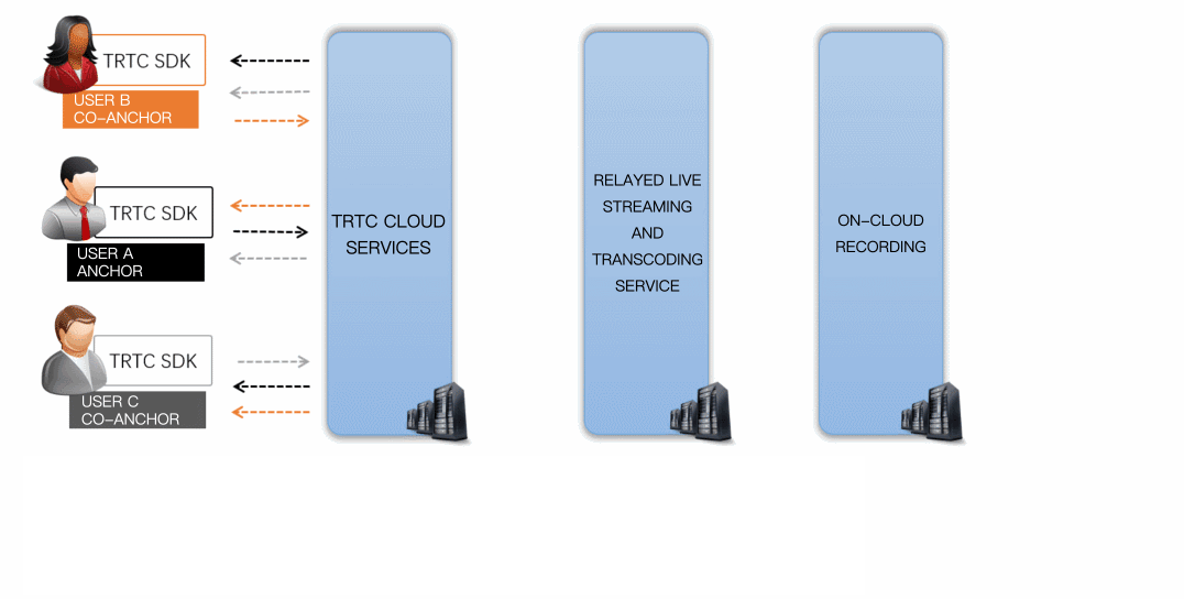 通过调用 TRTC SDK 提供的一些 API 接口和参数,即可实现云端混流、云端录制和旁路直播三个功能: