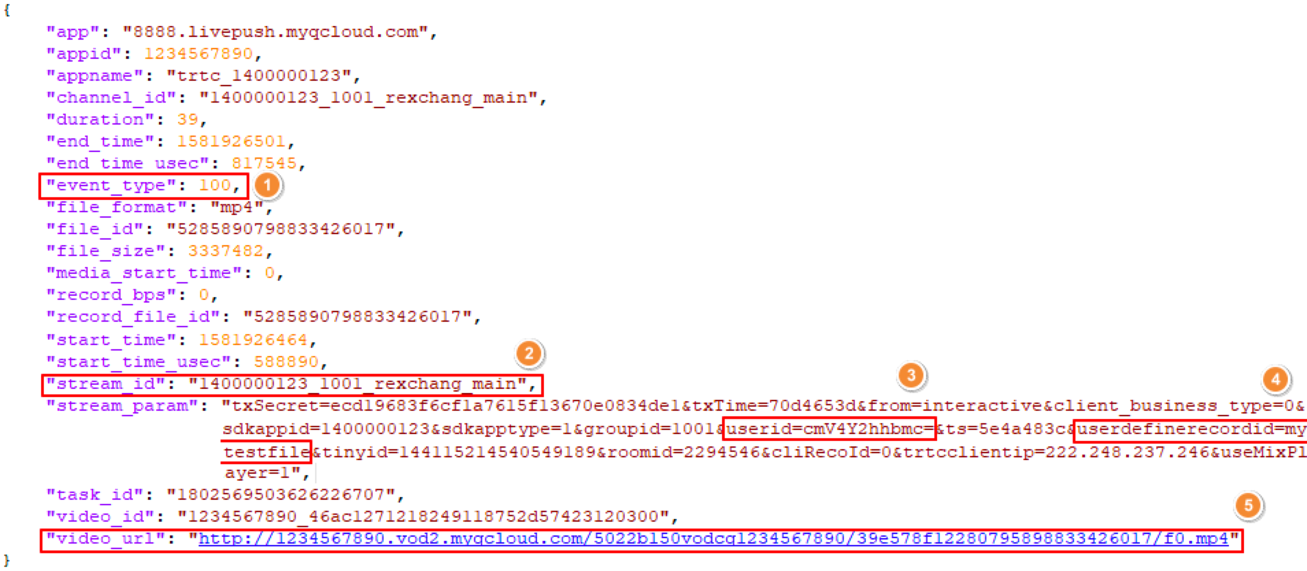 | event_type | 消息类型,当 event_type 为100时,表示该回调消息为录制文件生成的消息。 |