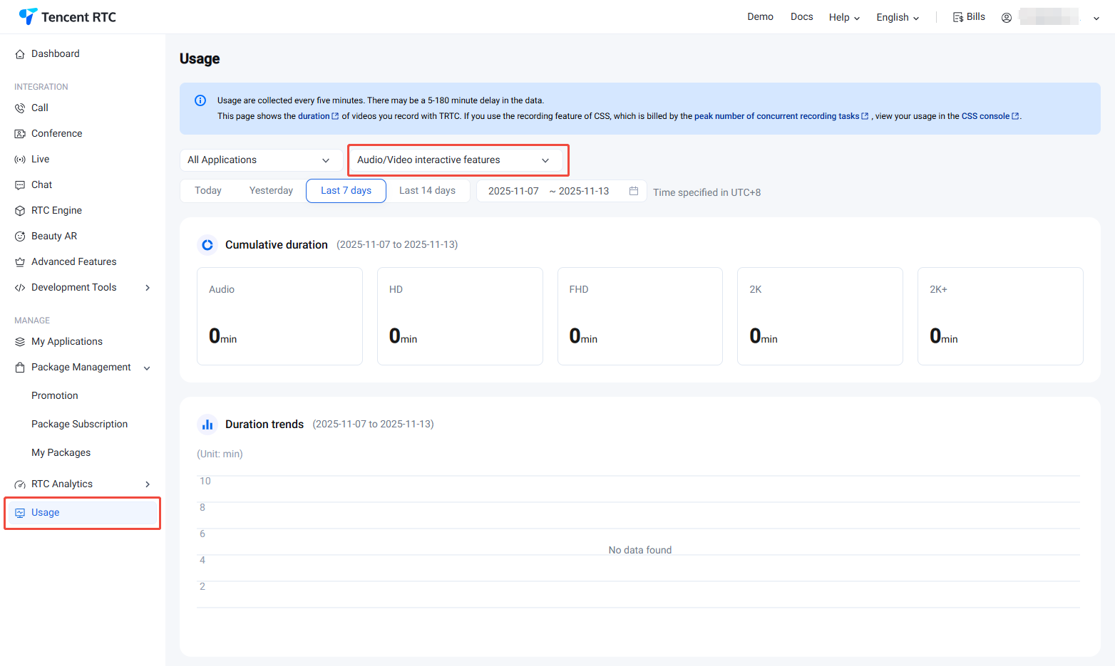 实时音视频控制台的音视频互动用量统计,支持查看已创建应用消耗的详细用量数据。