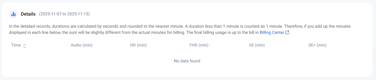 流水显示数据以秒计算,再按分钟取整,不足1分钟计为1分钟。因此若将以下每行流水显示的分钟数直接相加,将与实际结算分钟数略有差异。最终计费用量以 费用中心 输出的账单为准。