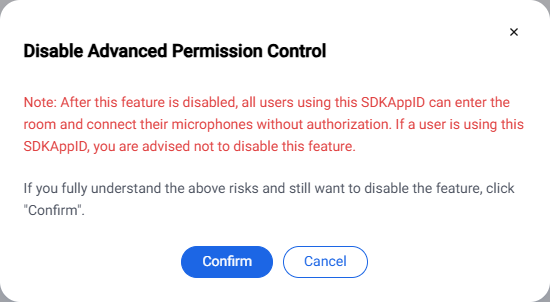 2. 进入目标应用的 Advanced Features 配置页面,在启用高级权限控制右侧单击按钮,弹窗中单击 Confirm 完成关闭。