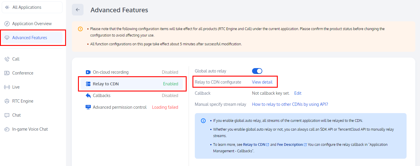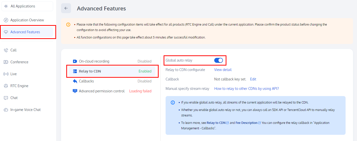 应用创建成功后,您可通过功能配置为您当前的应用开启 旁路转推云端录制 和 高级权限控制 功能,该页面所有功能配置修改成功后大约5分钟生效。