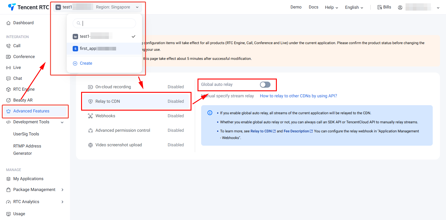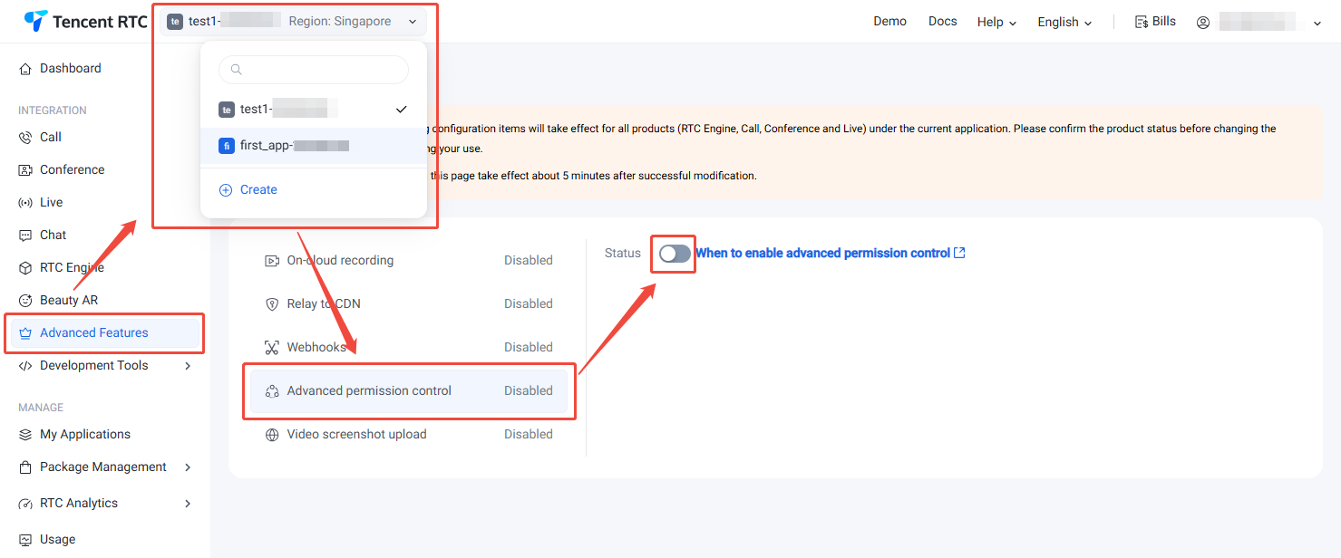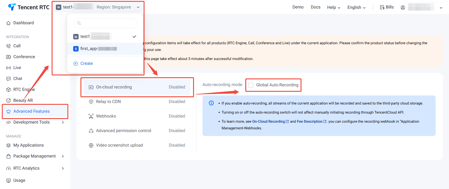 1. 进入 Tencent RTC 控制台 > Advanced Features,在左上角选择目标应用。同时,您也可点击 Create 在此快速创建新应用。