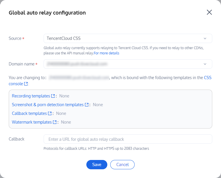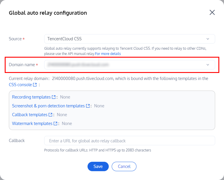 1. 您当前默认的推流域名为 xxxx.livepush.myqcloud.com/xxx.tlivecloud.com,并且支持切换您在 云直播控制台 绑定的推流域名,如需切换其他推流域名请先前往云直播控制台进行绑定