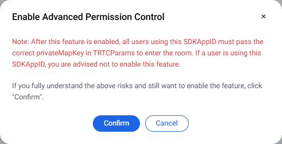 开启高级权限控制后,当前 SDKAppID 的所有用户都需要在 TRTCParams 中正确传入 privateMapKey 参数才能成功进房。如果线上有使用此 SDKAppID 的用户,请不要轻易开启此功能。