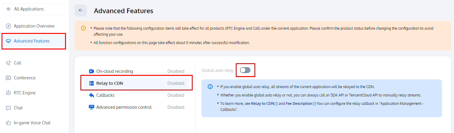 TUIPusher & TUIPlayer 实现的快直播和标准直播依托于腾讯云 云直播服务,因此支持快直播和标准直播线路需要您开启旁路推流功能。 1. 在 实时音视频控制台 每个应用的高级功能中为您正在使用的应用开启旁路推流配置,可按需开启全局自动旁路。 3. 在 TUIPlayer/src/config/basic-info-config.js 配置文件中配置播放域名。
