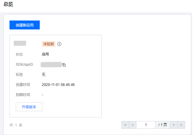 3. 您可在 即时通信 IM 控制台 总览页面查看新建应用的状态、业务版本、SDKAppID、创建时间以及到期时间。请记录 SDKAppID 信息。 步骤2:获取 IM 密钥并开通实时音视频服务