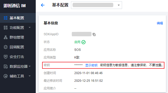 1. 在 即时通信 IM 控制台 总览页单击您创建完成的即时通信 IM 应用,随即跳转至该应用的基础配置页。在 基本信息 区域,单击 显示密钥,复制并保存密钥信息。