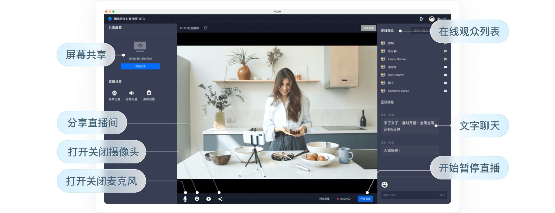 贴合直播场景需求,提供了含 UI 的直播场景通用解决方案,覆盖了直播场景常见功能(如设备选择、美颜、直播推流、观众拉流、聊天等),助力业务快速上线。