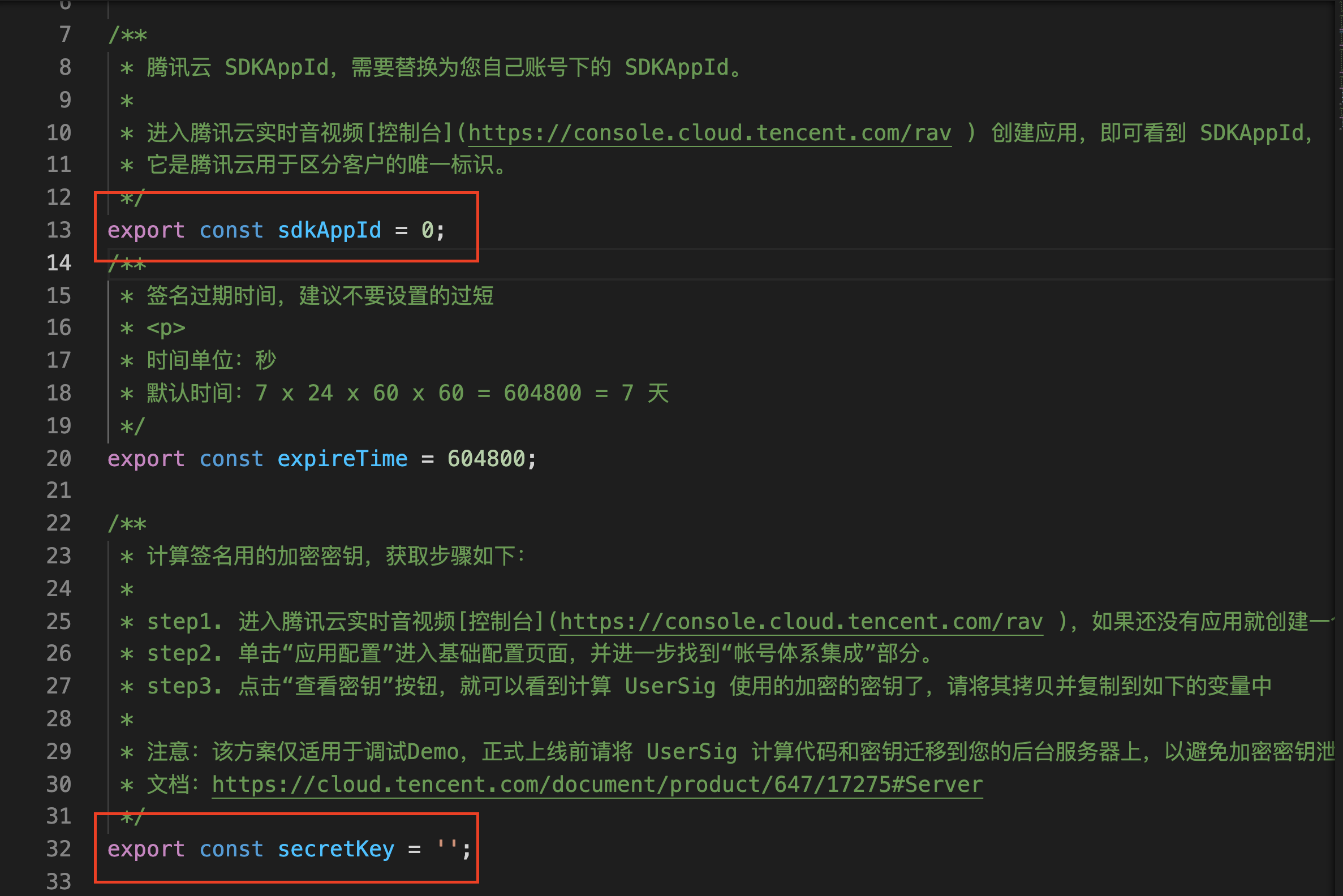 3. 将 sdkAppId 和 secretKey 填入 TUIPusher/src/config/basic-info-config.js 及 TUIPlayer/src/config/basic-info-config.js 配置文件中。