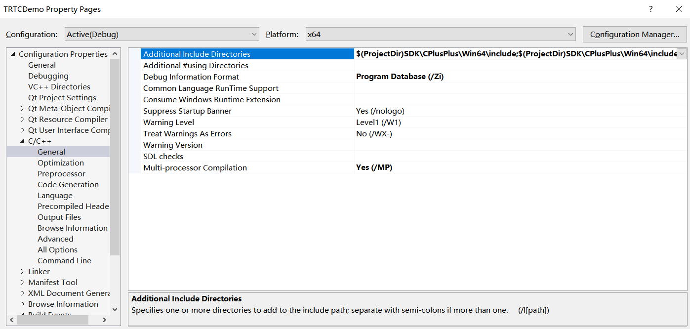 $(ProjectDir)SDK\\CPlusPlus\\Win64\\include 和 $(ProjectDir)SDK\\CPlusPlus\\Win64\\include\\TRTC,如下图所示:$(ProjectDir)SDK\\CPlusPlus\\Win32\\include 和 $(ProjectDir)SDK\\CPlusPlus\\Win32\\include\\TRTC。