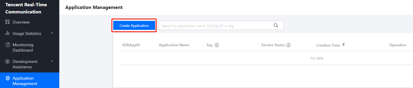 实时音视频控制台 单击 应用管理 > 创建应用 创建新应用。