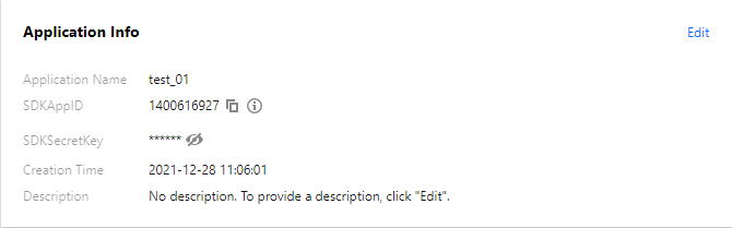 2.1 应用管理 > 应用信息 中获取 SDKAppID 信息。SDKAppID 为 TRTC 的应用 ID,用于业务隔离,即不同的 SDKAppID 的通话不能互通。