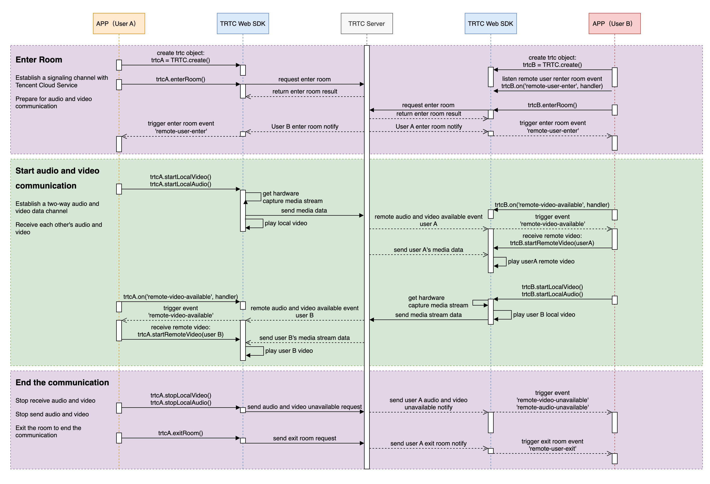 TRTC.create() 方法创建 trtc 对象。trtc.enterRoom() 方法进入房间,进入后其他用户会收到 TRTC.EVENT.REMOTE_USER_ENTER 进房事件。TRTC.startLocalVideo() 开启摄像头并发布到房间。TRTC.startLocalAudio() 开启麦克风并发布到房间。trtc.startRemoteVideo() 方法播放远端视频。