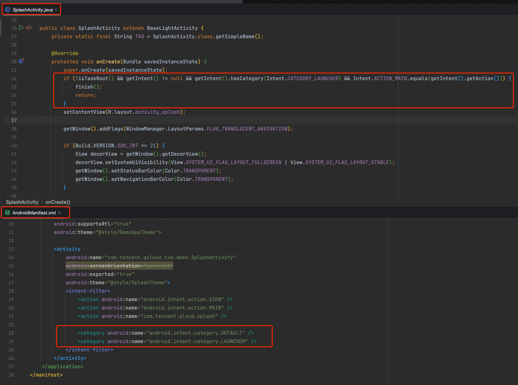 以上几种情况,需要在您自己业务的默认启动的主 Activity 中添加以下代码,每个应用默认启动的 Activity 都不一样,详见 AndroidManifest.xml 配置,以目前大部分应用的启动页 SplashActivity 为例: