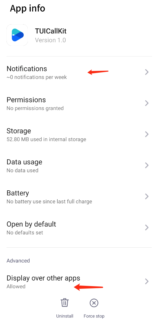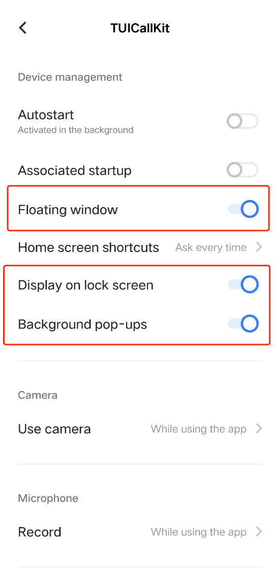 1. TUICallKit 2.3 及以上版本调整了被叫端的来电显示策略,见下方:被叫端来电显示策略。 2. TUICallKit 2.3 版本之前,将应用从后台自动拉取到前台,需要检查 App 是否开启了“后台自启动”或“悬浮窗”权限。