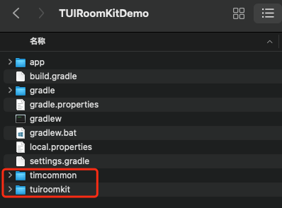 Android目录下的timcommon、 tuiroomkit子目录到您当前工程中的 app 同级目录中,如下图: