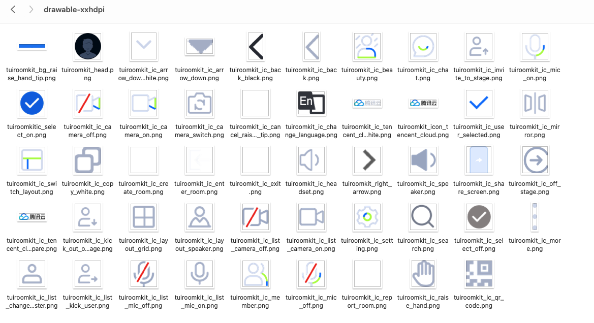 Android/tuiroomkit 文件夹下面:src/res/drawable-xxhdpi 文件夹下的图标,以确保整个 App 中的图标色调风格保持一致,请在替换时保持图标文件的名字不变。