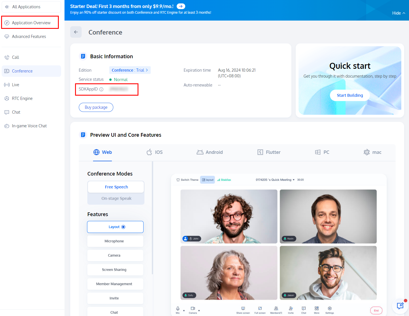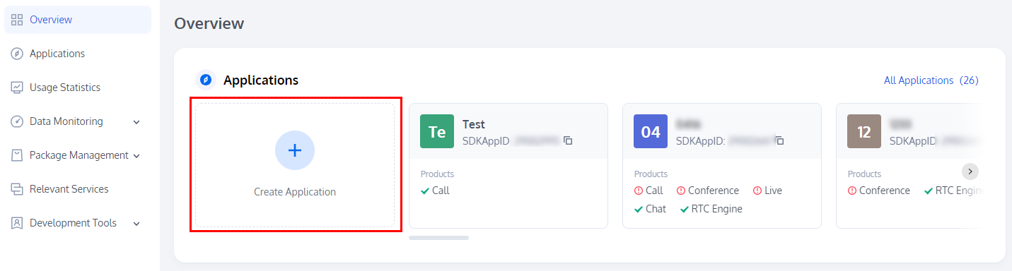 3. 应用程序创建后,默认进入所选产品详情页。您可在 Application Overview 查看 SDKAppID 和 SDKSecretKey, 会在后续步骤中使用到。