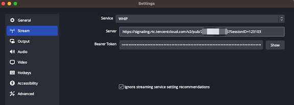 具有 WHIP 支持的 OBS,请从 OBS 下载。 腾讯实时音视频(TRTC)账户,请在 此处 注册。 接下来,您需要创建一个 TRTC 应用程序,并为 WHIP 生成一个 Bearer 令牌。
