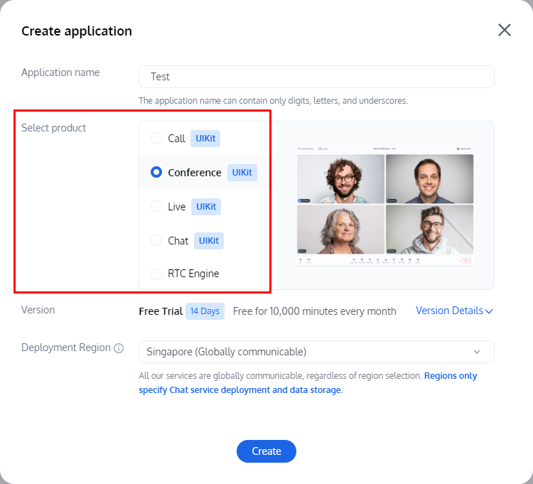 2. 在创建弹窗中实际业务需求选择产品并输入应用名称,选择数据存储地区,点击 Create。