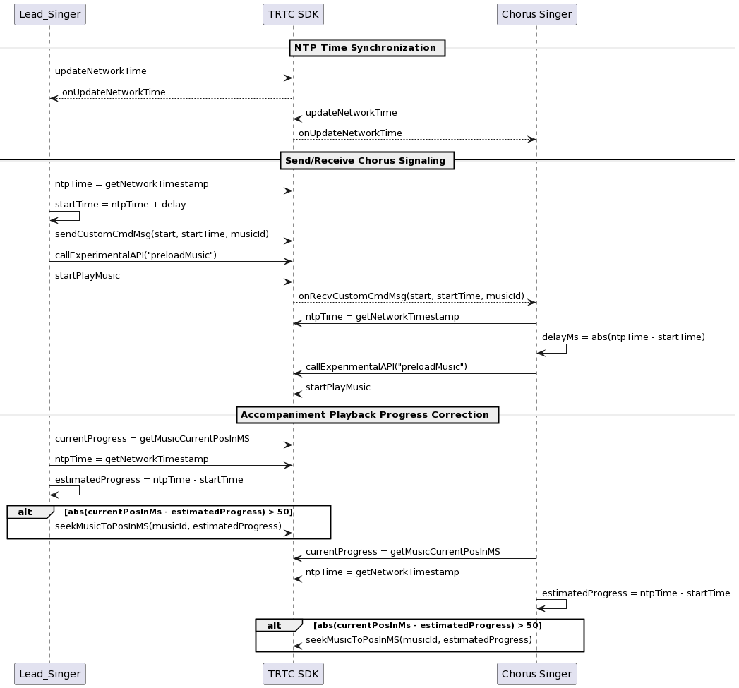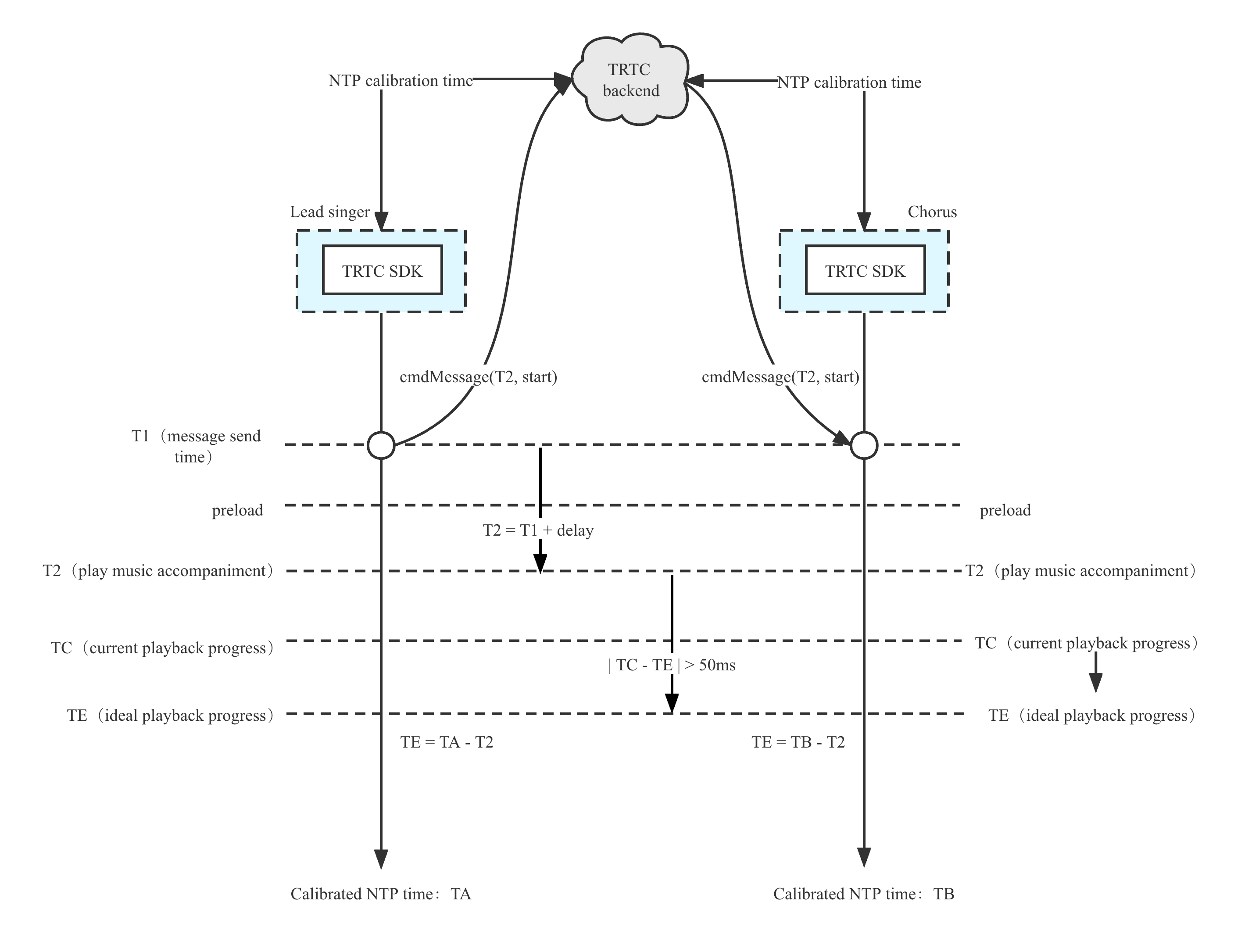 long mStartPlayMusicTs = "最初约定的合唱时间";long currentProgress = subCloud.getAudioEffectManager().getMusicCurrentPosInMS(musicID);// 当前歌曲的理想播放时间进度long estimatedProgress = getNtpTime() - mStartPlayMusicTs;// 当播放进度超过50ms,进行修正if (estimatedProgress >= 0 &&; Math.abs(currentProgress - estimatedProgress) > 50) {subCloud.getAudioEffectManager().seekMusicToPosInMS(mMusicID, (int) estimatedProgress);}