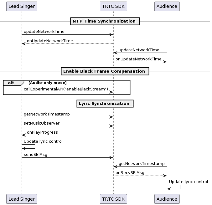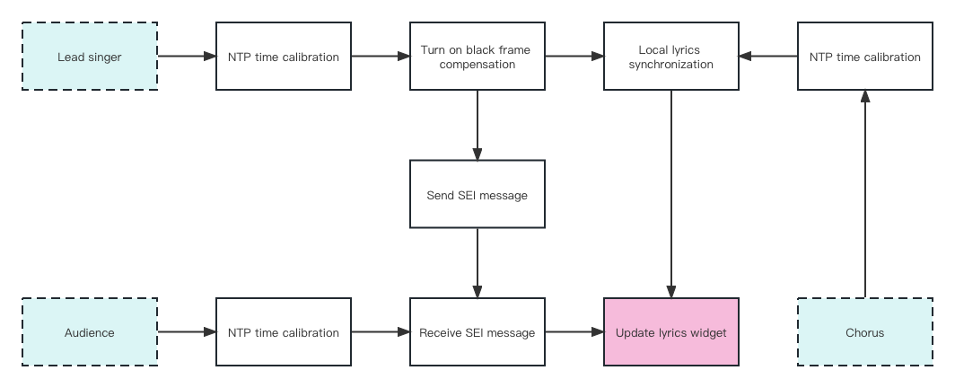 NTP 校时 开启补黑帧 发送 SEI 消息 本地歌词同步 更新歌词控件 | NTP 校时 本地歌词同步 更新歌词控件 | NTP 校时 接收 SEI 消息 更新歌词控件 |