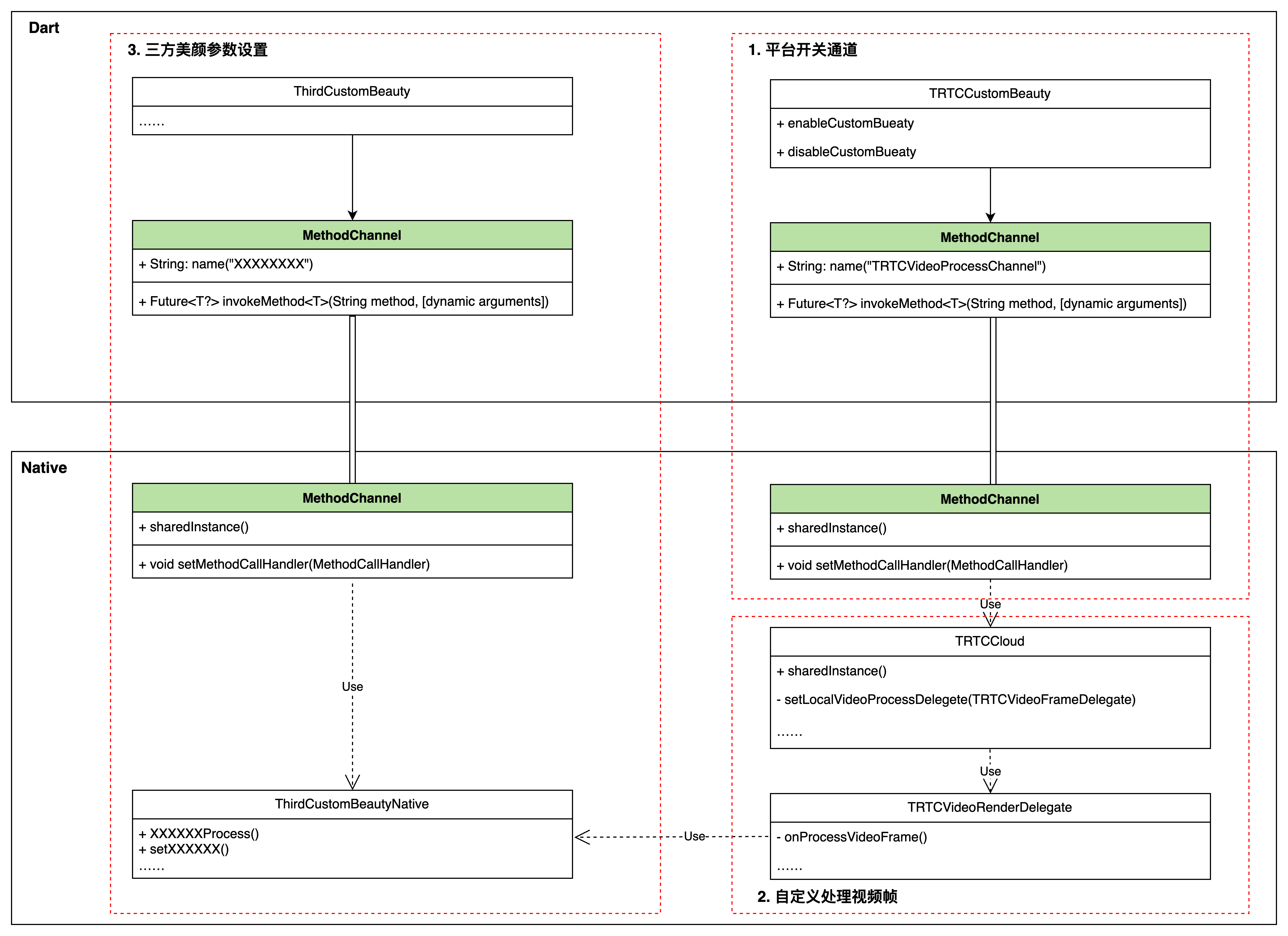 第三步:客户的美颜处理模块也需要在 Dart 通过接口设置当前美颜的参数,客户可以通过 MethodChannel 的方式设置美颜参数。这部分客户可根据自己的需求和使用的美颜自行定制。final channel = MethodChannel('TUICallKitCustomBeauty');void enableTUICallKitCustomBeauty() async {await channel.invokeMethod('enableTUICallKitCustomBeauty');}void disableTUICallKitCustomBeauty() async {await channel.invokeMethod('disableTUICallKitCustomBeauty');}