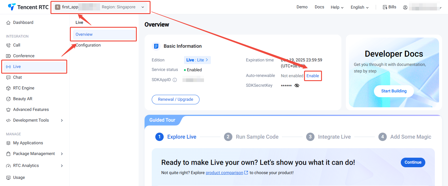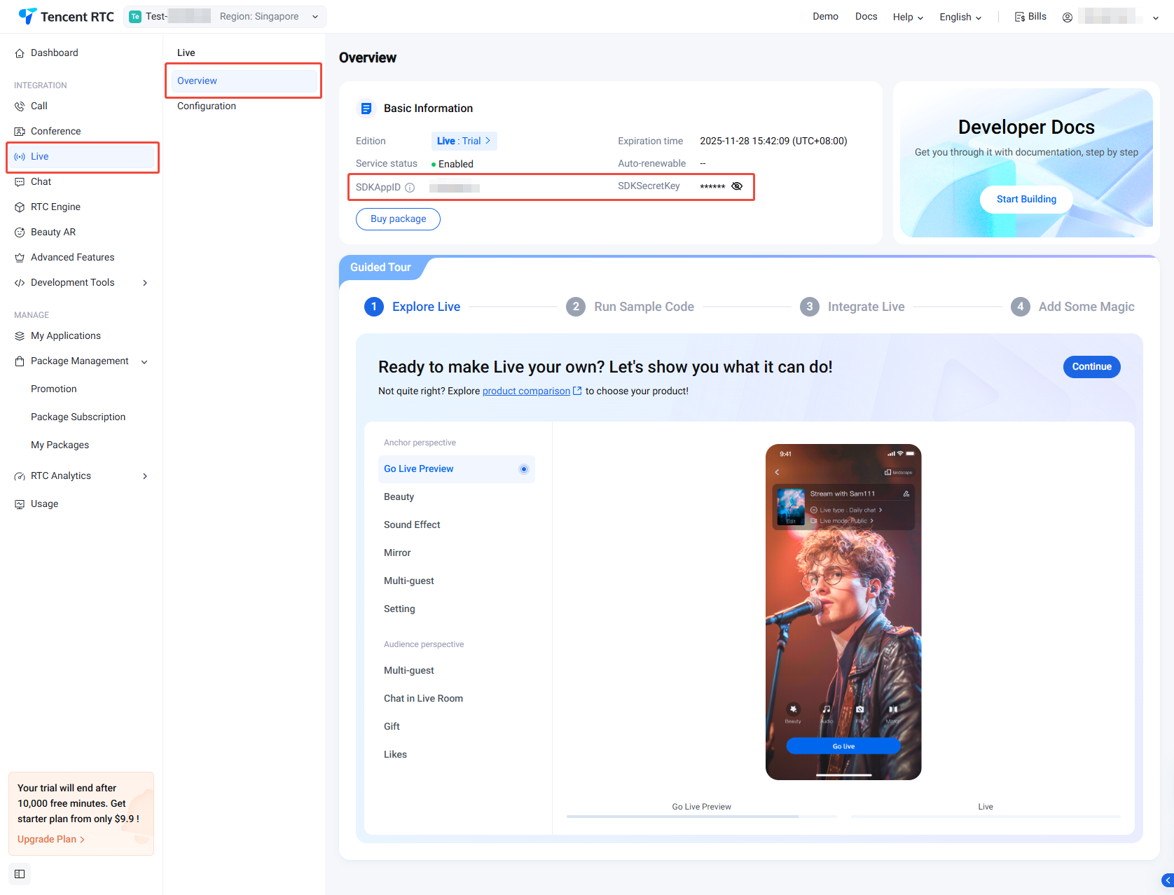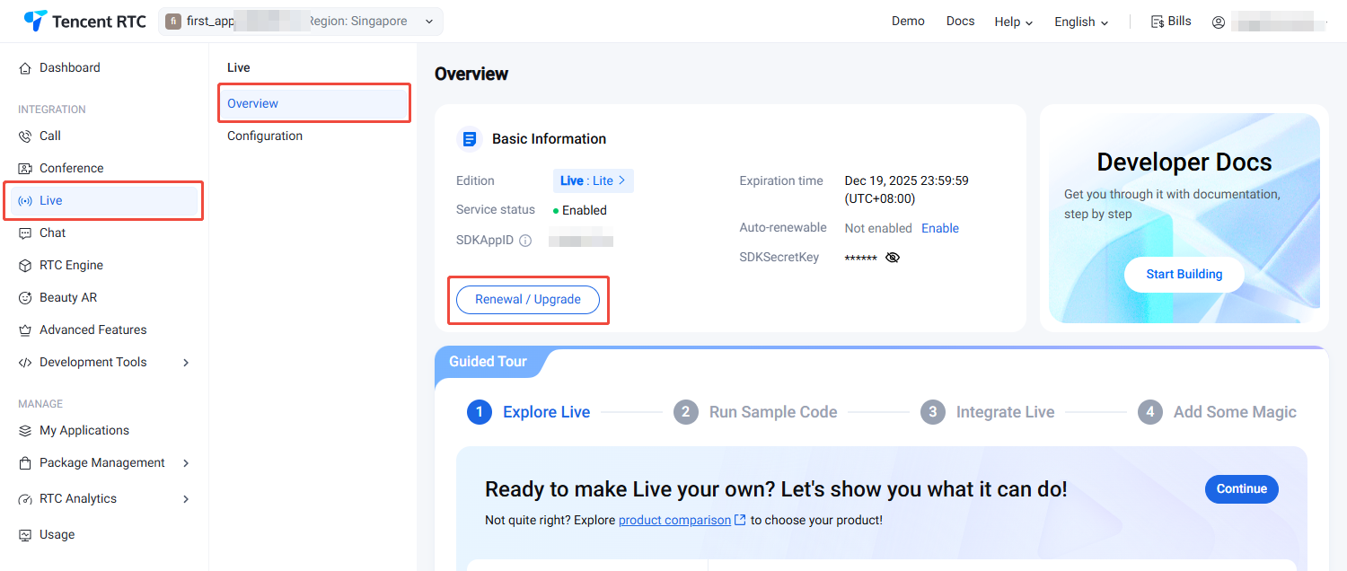 完成应用创建后将默认进入 Live 产品详情页面,此时您已快速创建应用并已成功领取实时互动直播 Live(TUILiveKit)体验版。可在当前